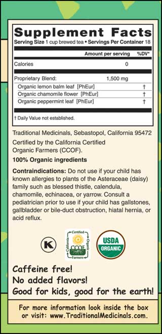 オーガニックコールドケアティーに加えられた、カモミールとペパーミントはお子様にも飲みやすい味付けにしています。風邪の季節に体を丈夫にするのを助けます。